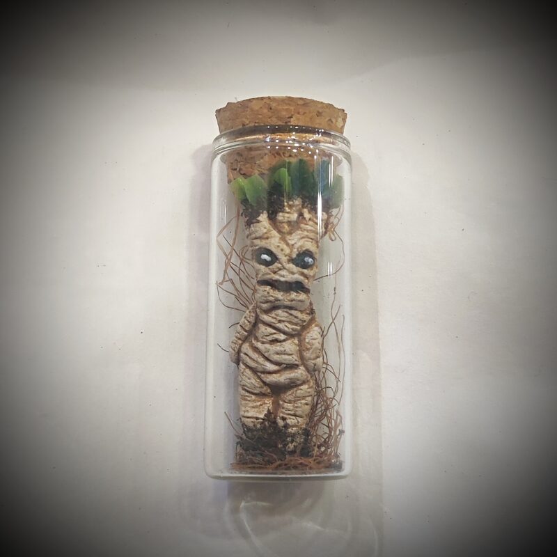 Dans sa petite fiole en verre étiquetée « Mandragore »,cette petite sculpture miniature semble prête à s’enraciner dans n’importe quel jardin pour le rendre magique!
